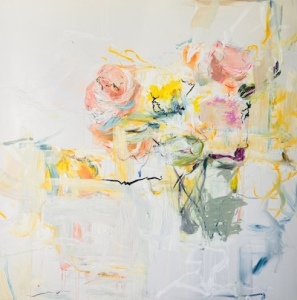 For this show, Greenberg continues to explore large canvas formats, allowing for expansive gestures in addition to more intimate line work drawn directly into the paint. Ever cognitive of negative space, she explores three-dimensional twists and turns of color on a flat plane. Her smaller works, amass almost a tactile sculptural quality. Throughout, she returns to botanical inspiration. Forms from cut flowers in her studio are showcased in her paintings, and the hues from these explore new more immersive color relationships.